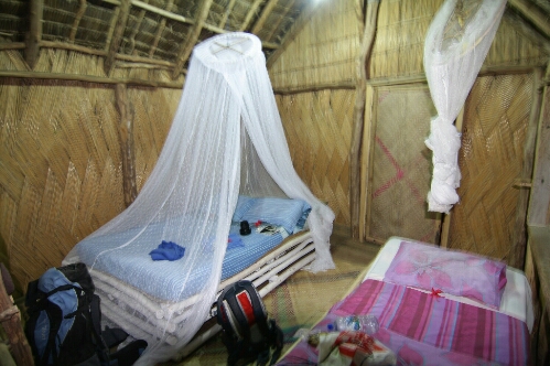 Jetzt musste noch der Wocheneinkauf gemacht werden, wir steuerten verschiedene Läden (Hütten) und Märkte an. Nach und nach füllte sich die Ladefläche, irgendwann saßen wir zwischen Nen Sack Mehl, Einen Sack Kartoffeln, Möhren, Gurcken, Kawawurzeln, ner Stiege Milch, einen Kanister Benzin (für den Generator) und diversen anderem Kram. Bei den holprigen Pisten musste man dann schon aufpassen das nicht ein Bund Möhren unterwegs verloren Ging. Bevor alles zusammen war, haben wir gefühlt an jedem Markt auf der Insel angehalten. Irgenwann erreichten wir auch die Unterkunft, hinter den 7 Bergen, nebem dem Vulkan, www (weit weit weg). Die Unterkunft war fantastisch. Ich hatte einen kleinen Pfahlbungalow, direkt am Strand, mit Dusche und allem Drum und Dran. Einfach und rustikal, aber gemütlich und super sauber.
