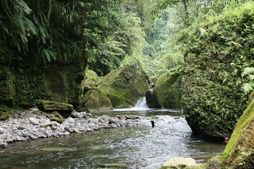 Hab dann ersteinmal ein Nickerchen in der Hängematte gemacht. Dann ein kleinen Schwimm im Meer und dann gabs abemds Abendessen. Das essen was gezaubert wurde war Super, alles selbstgemacht, sogar das Brot. Die Nacht war entspannt. Der nächste Tag begann mit einem leckeren Frühstück, incl. lokalen Kaffee. Nach einem erfrischenden Bad beschlossen der franzose und ich die gegemd zu erkunden. zunächst ging es die Küste entlang, dann etwas landeinwärtz. Vorbei an Manjok-, Taro-, Bananen-, Avocado- und Papaya Pflanzungen in den Regenwald. Ab und an erreichte man eine Siedlung, nicht viel mehr als ein Paar Strohhütten.